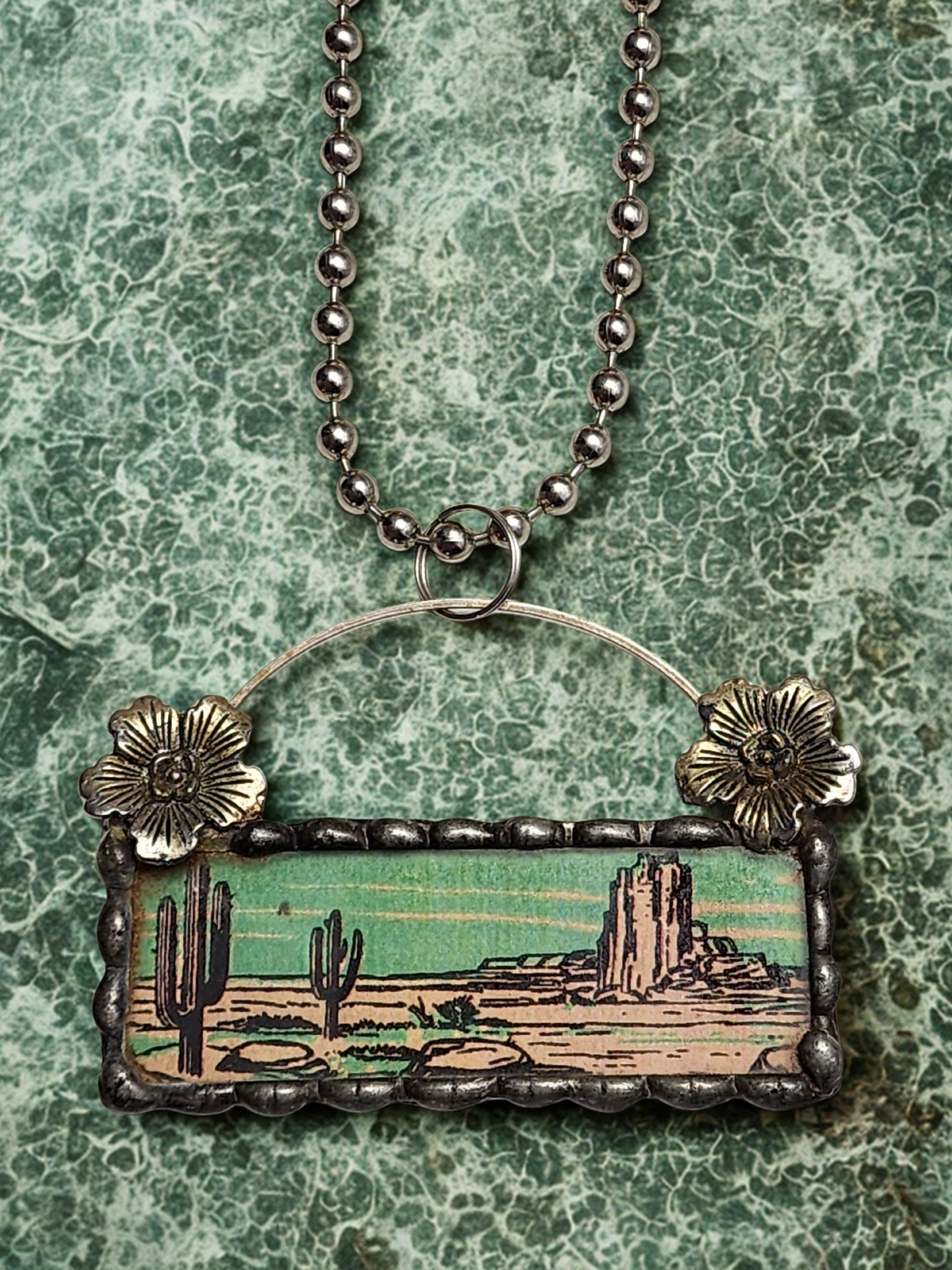 Bring the desert with you wherever you roam. This handmade necklace features a scenic Southwest illustration with cacti and mesas, framed in soldered metal and topped with two silver-toned desert flower accents. It's a rustic, romantic piece for wild hearts and wandering souls.