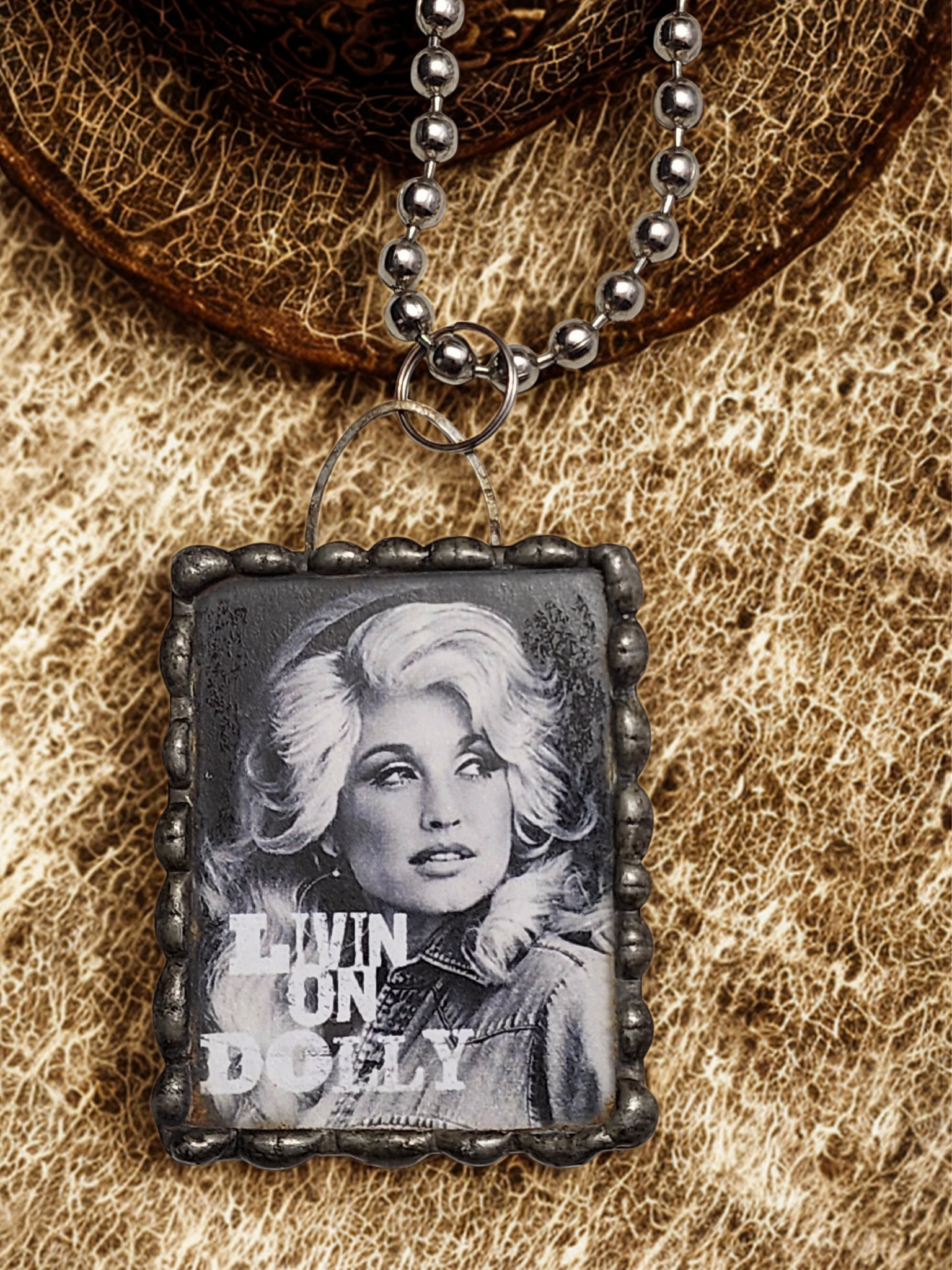 Pay homage to the queen of country with this handmade “Livin’ on Dolly” necklace. Featuring a grayscale portrait of Dolly Parton framed in rustic soldering on a ball chain, this bold pendant is perfect for dreamers, doers, and rhinestone rebels. A must-have for any Dolly fan.