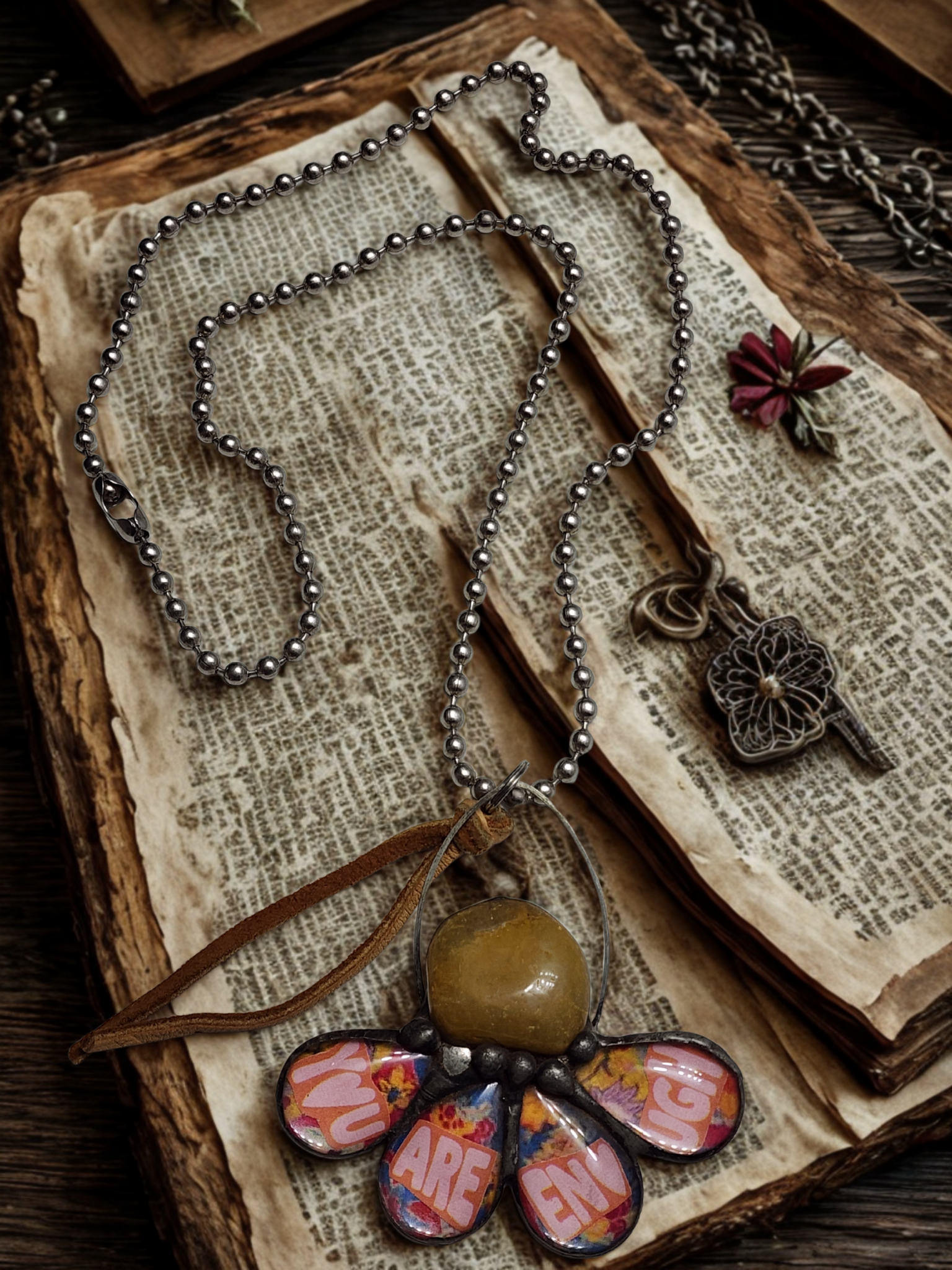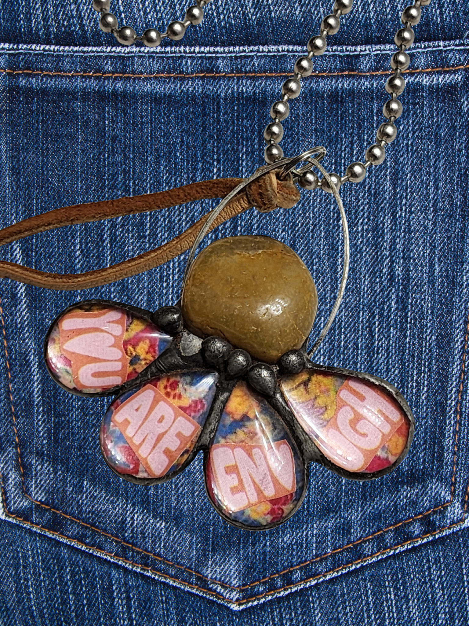 A powerful reminder wrapped in petals. This handmade flower pendant reads "You Are Enough" across each petal, layered over a vibrant floral background with a rustic soldered edge and earthy genuine yellow Jasper center stone. It's the perfect accent for any Western, boho, or everyday outfit — and a heartfelt gift for someone who needs to hear it.